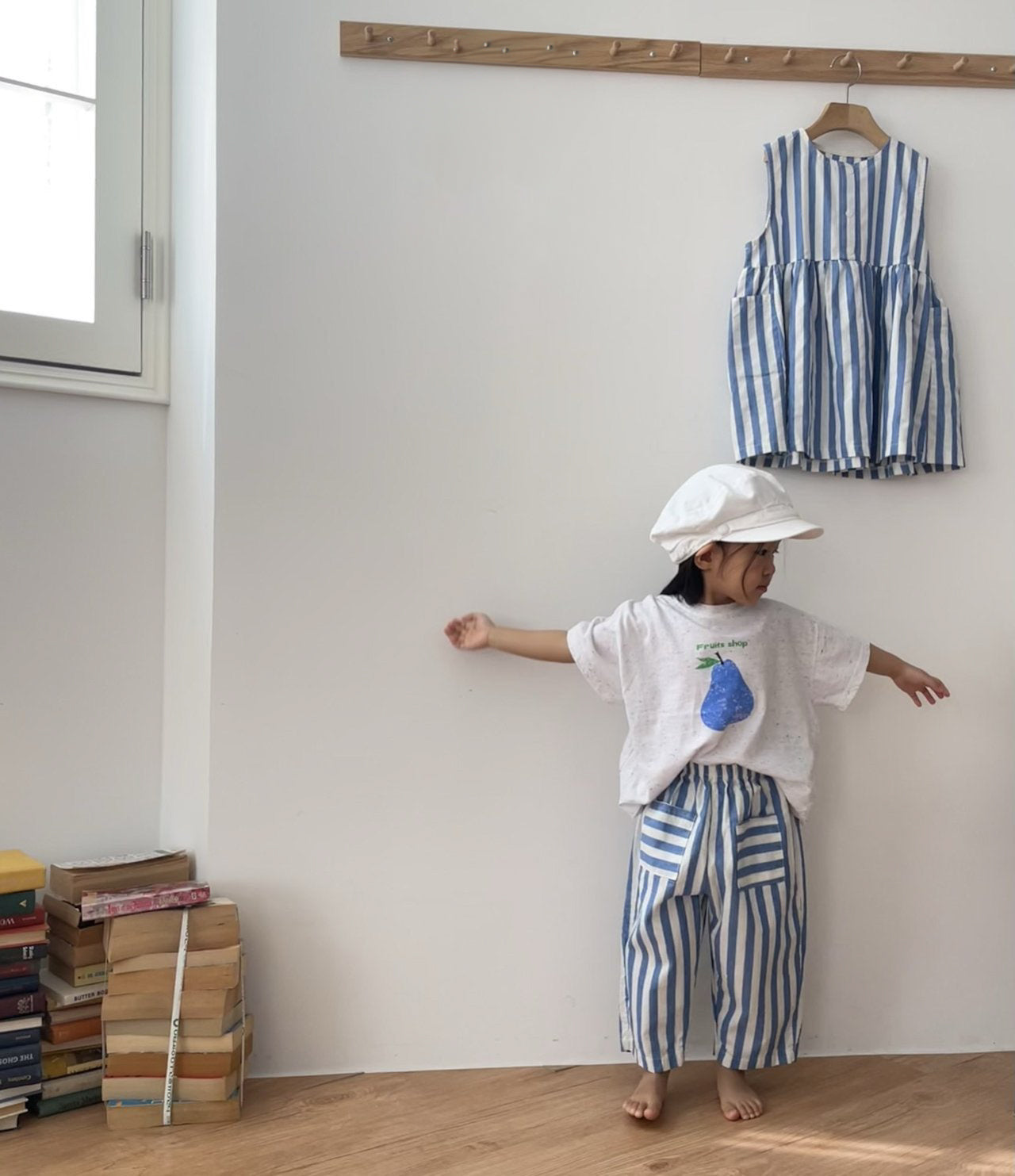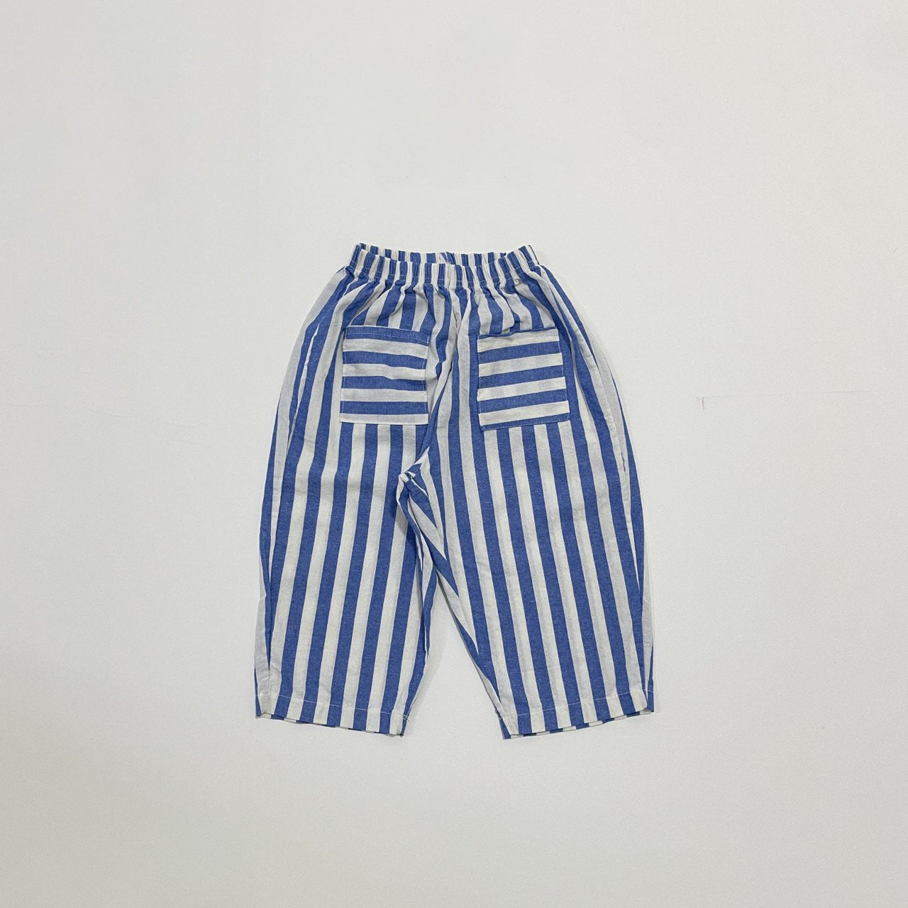 Casual gender neutral pants featuring stripes and front pocket details. Elastic waistband for ease and comfort.