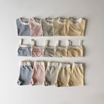 Buttery soft 3 piece lounge set includes a sleeveless tank, short sleeve tee, and matching shorts.