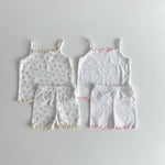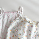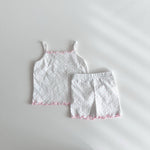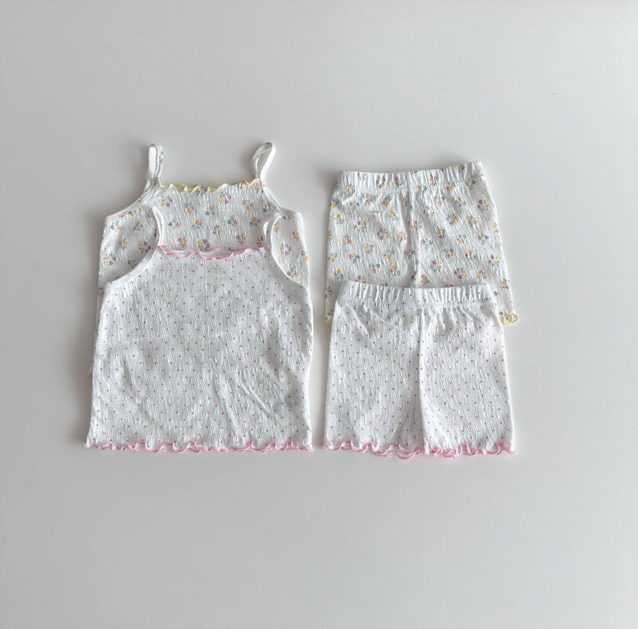 Spring floral cami and matching biker shorts featuring lettuce trim details.