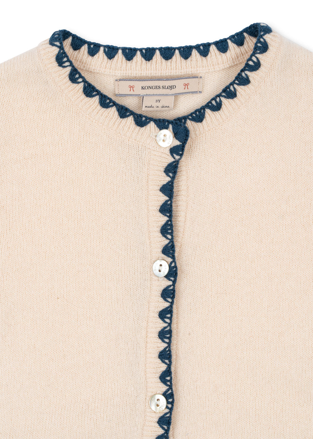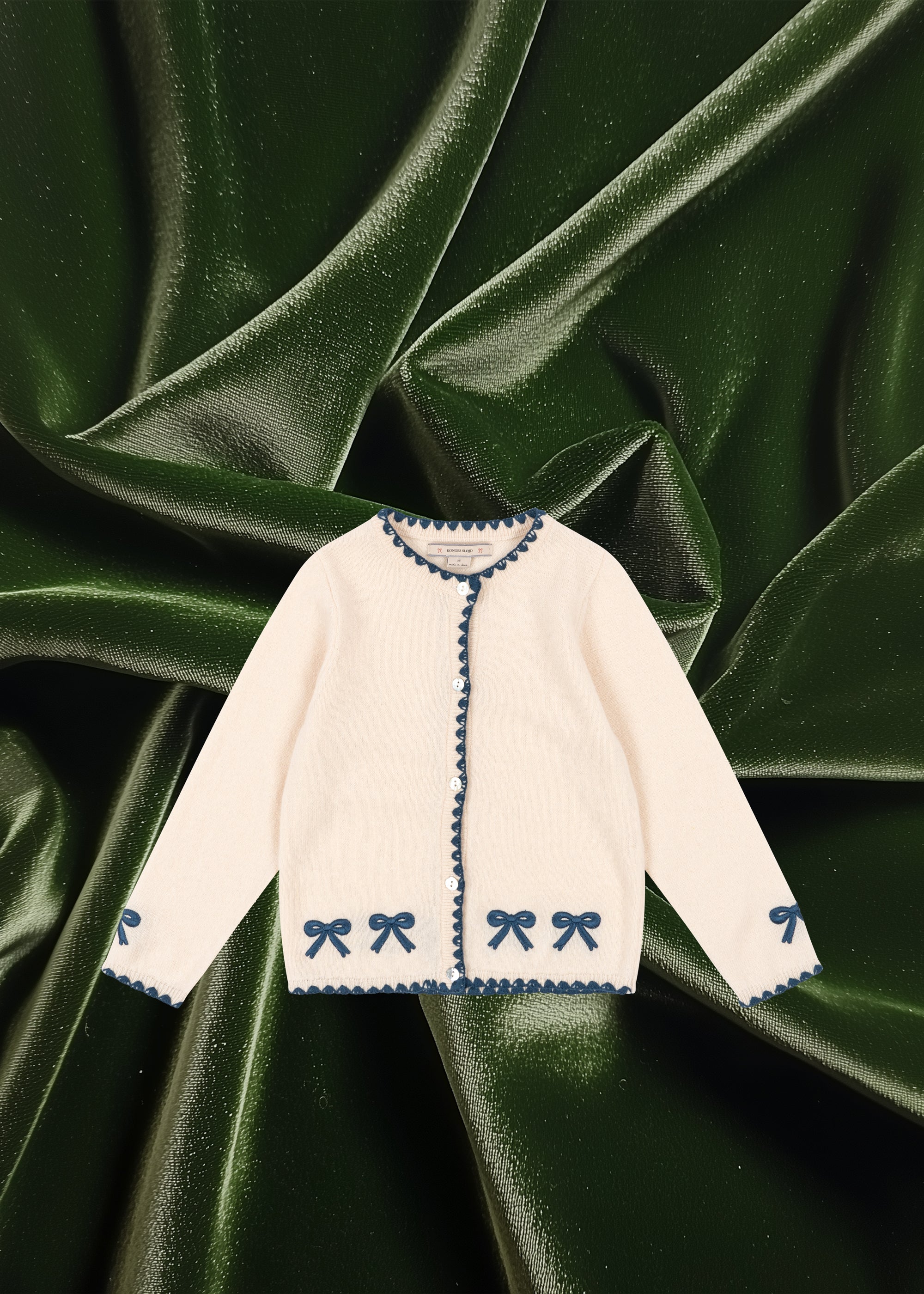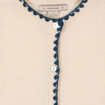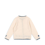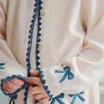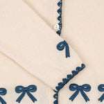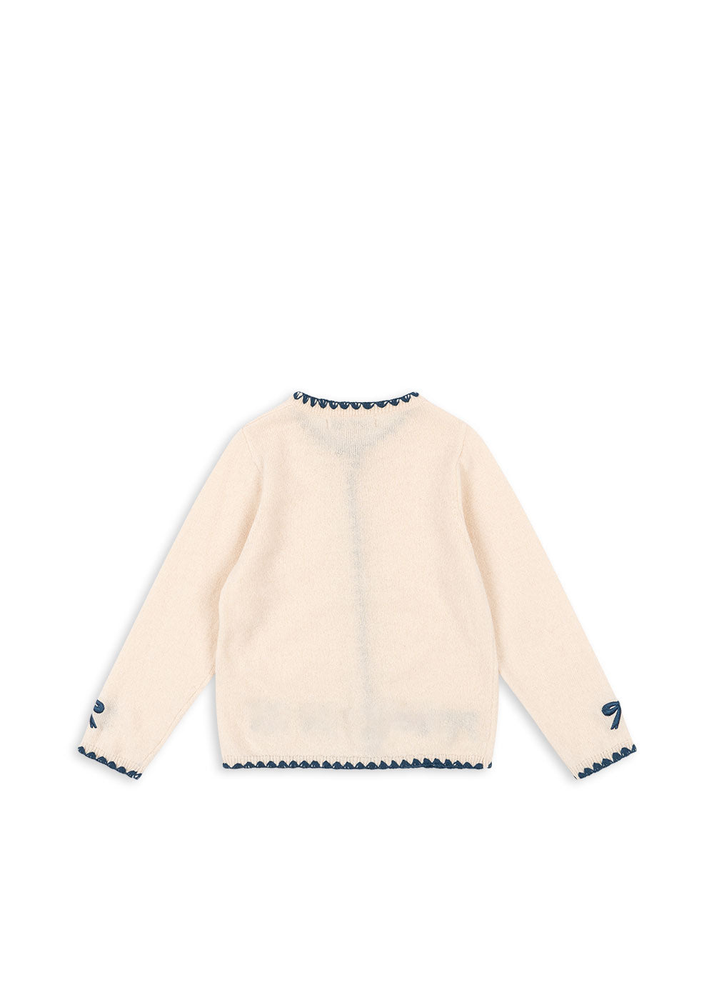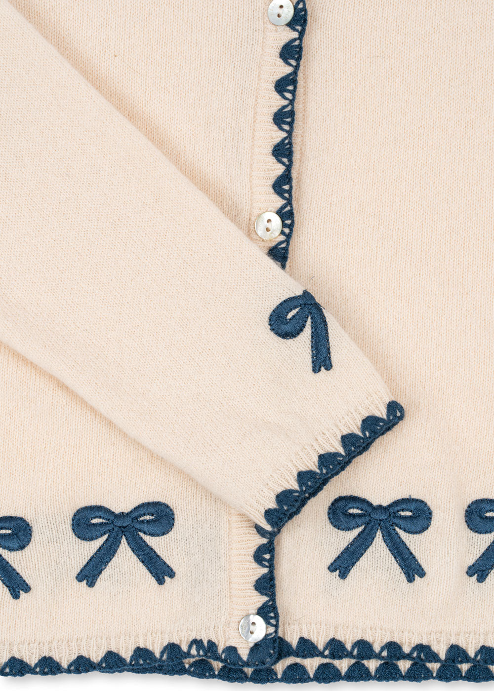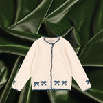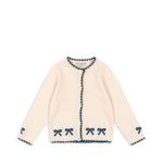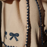 Soft and warm cardigan with contrast stitching along hems and embroidered bows.