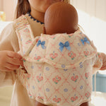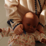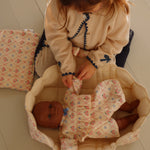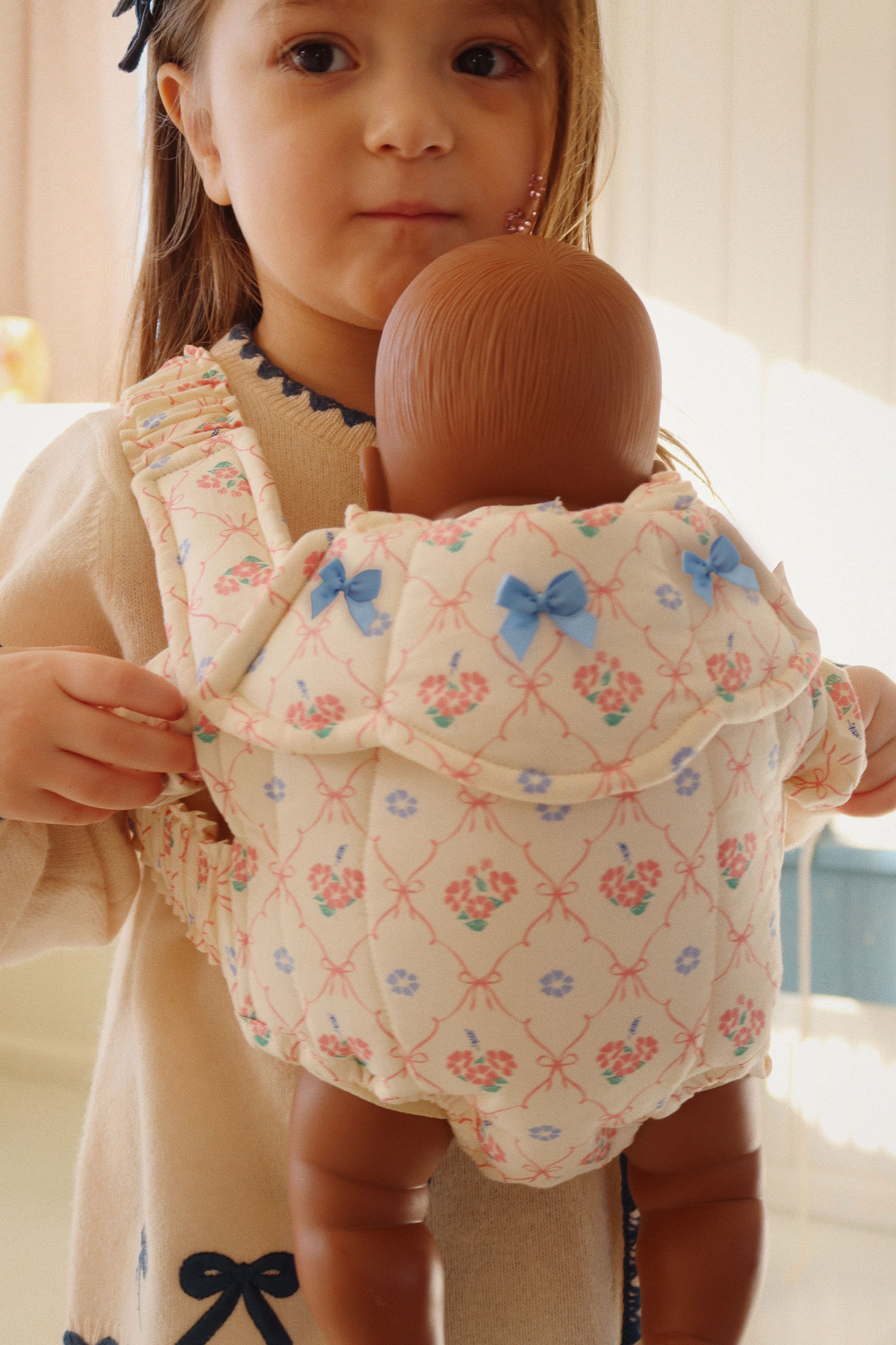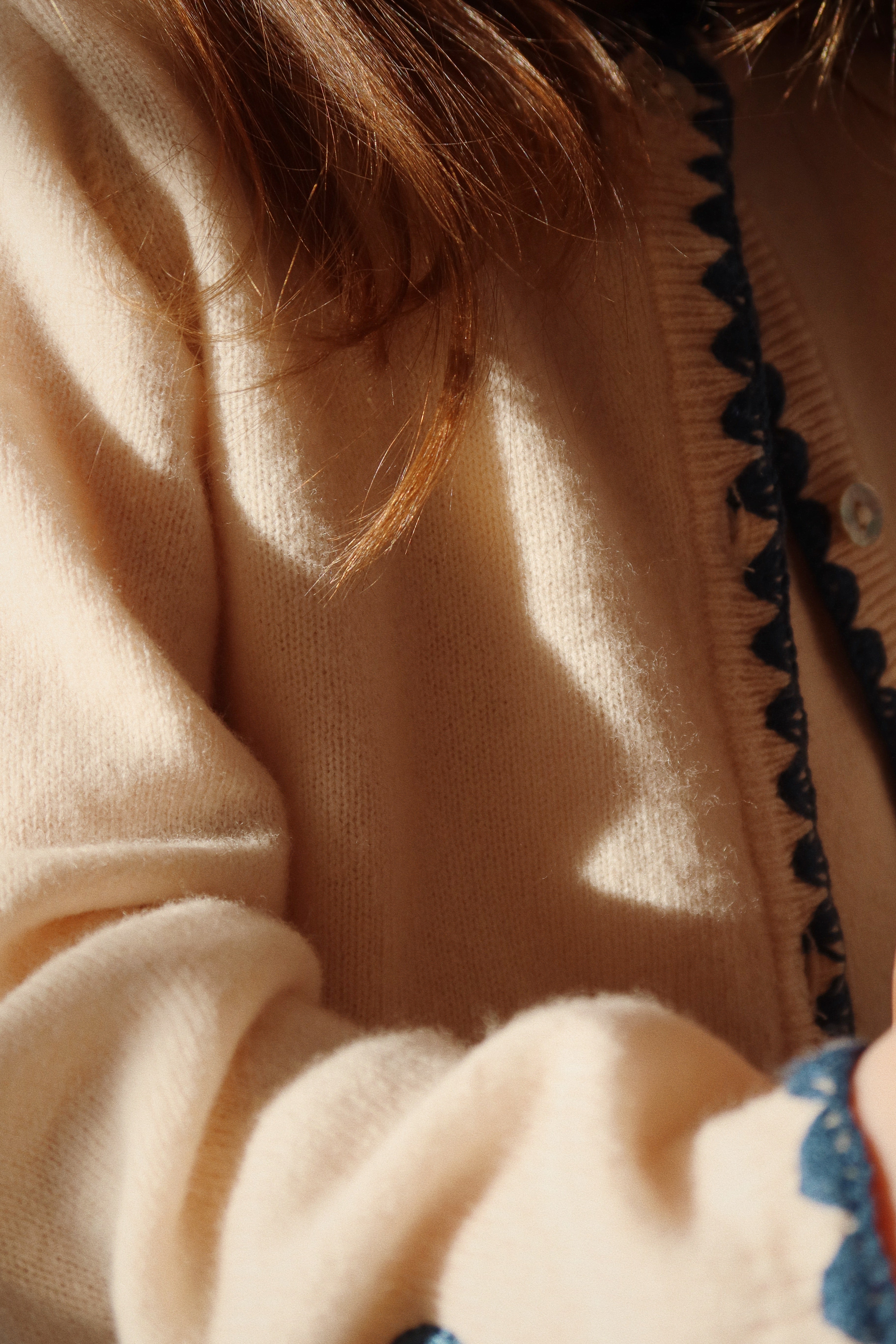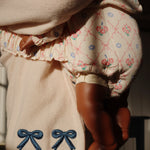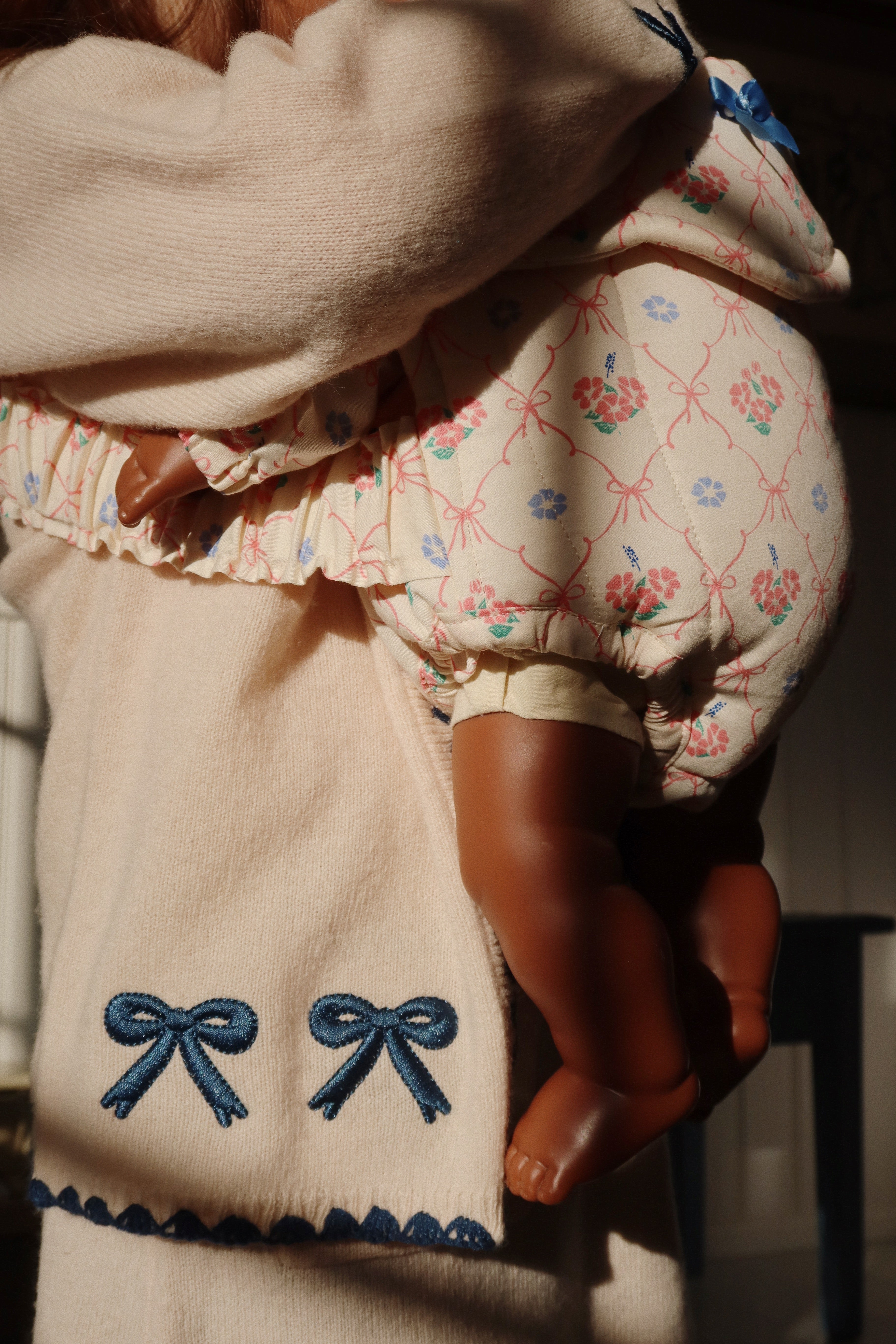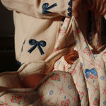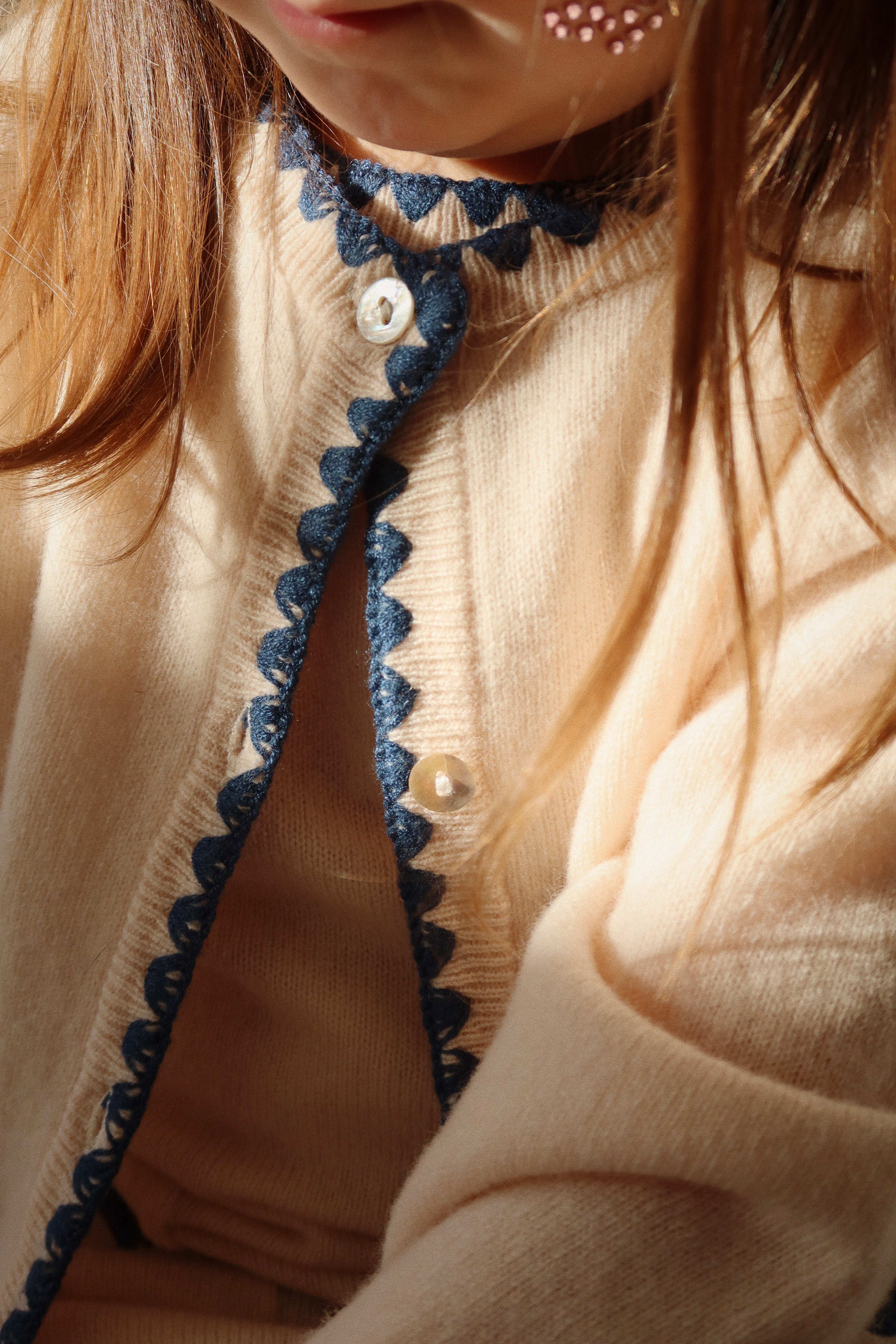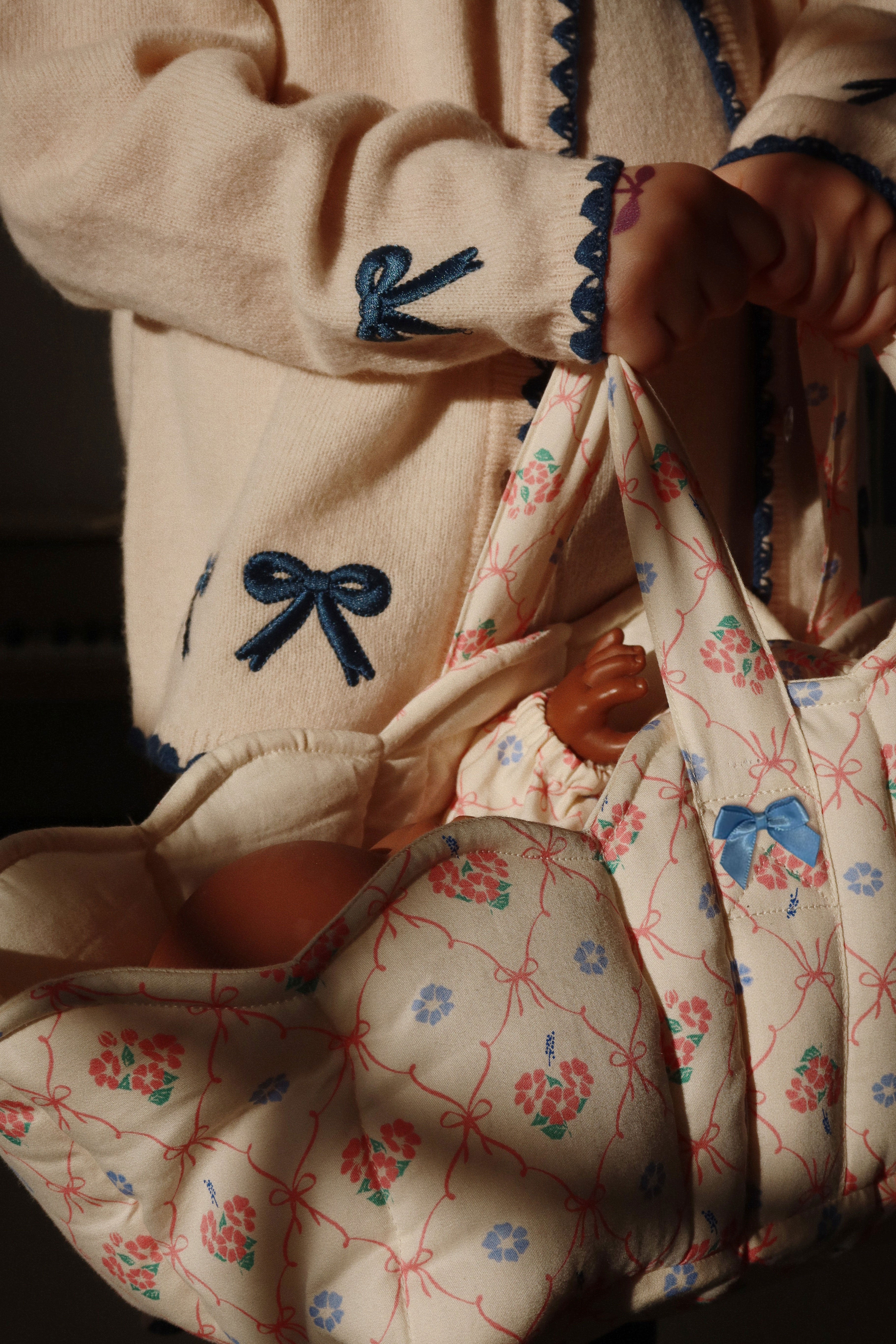 Soft and warm cardigan with contrast stitching along hems and embroidered bows.