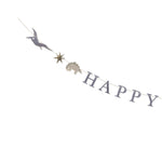 Cups: paper. Plates: paper. Napkins: paper. Garland: paper and cotton string. Balloon: aluminum foil. Cake toppers: paper on a bamboo stick.