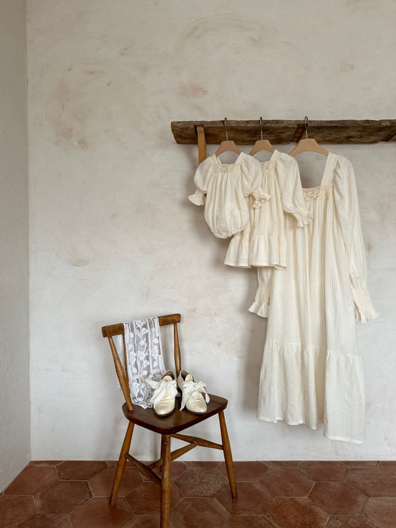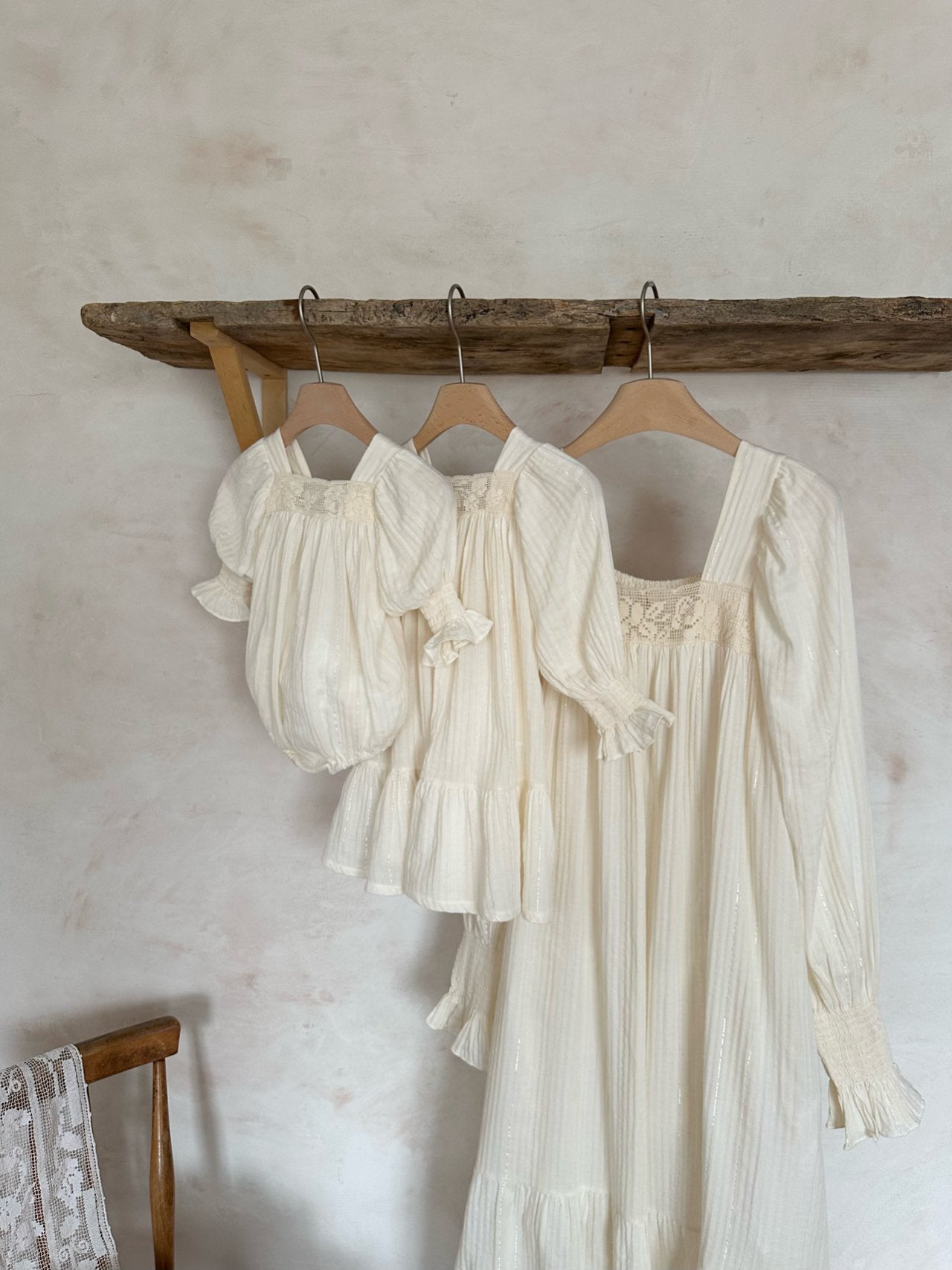 A sweet vintage inspired Mama + Mini look featuring puff sleeves and a floral trim detail across the chest.