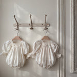 Vintage Puff Sleeve Romper | Beige Stripe