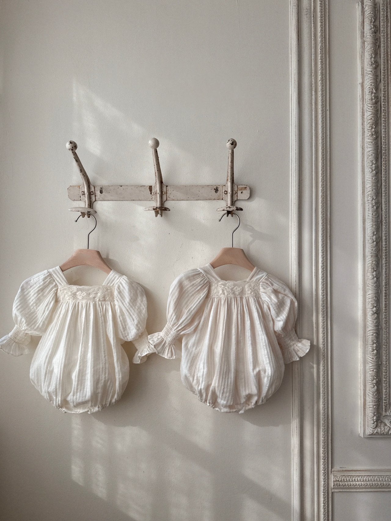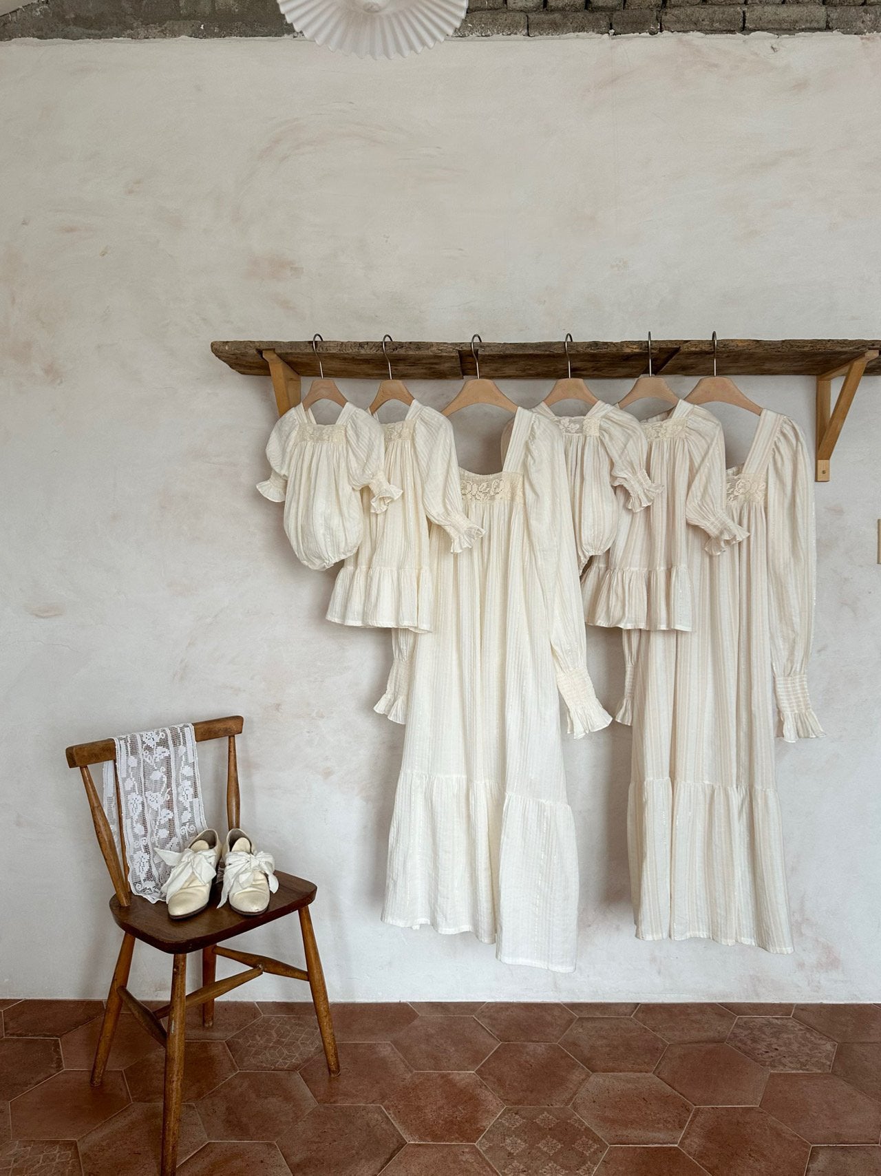 A sweet vintage inspired Mama + Mini look featuring puff sleeves and a floral trim detail across the chest.