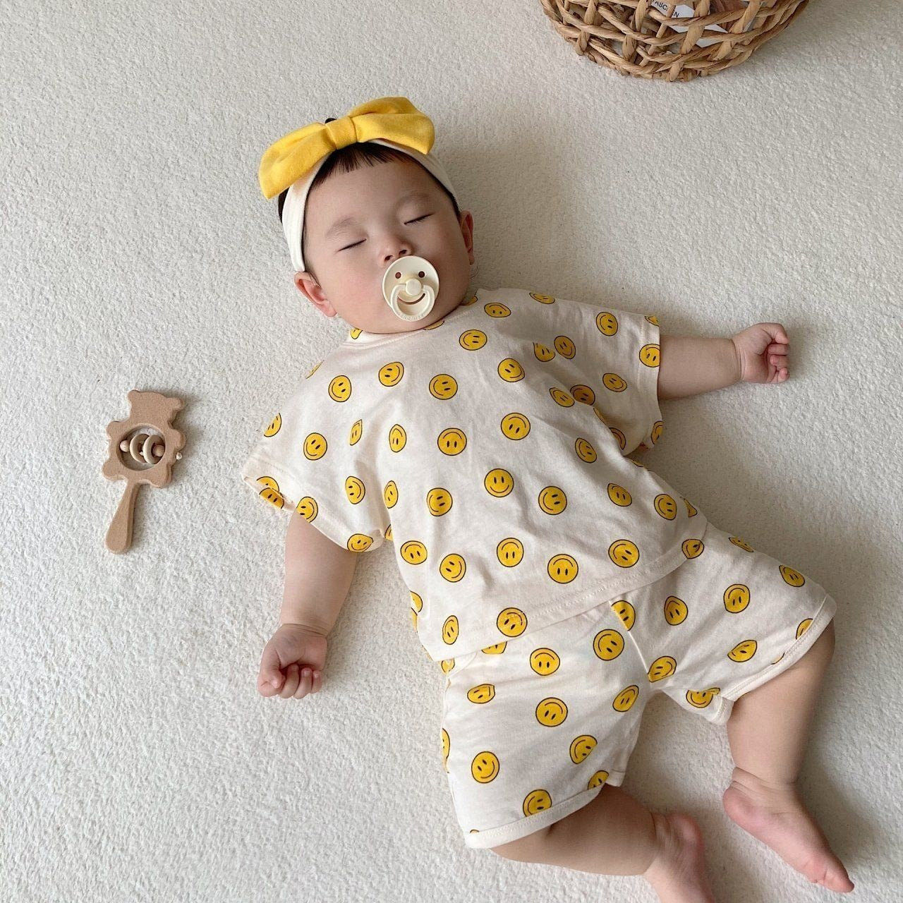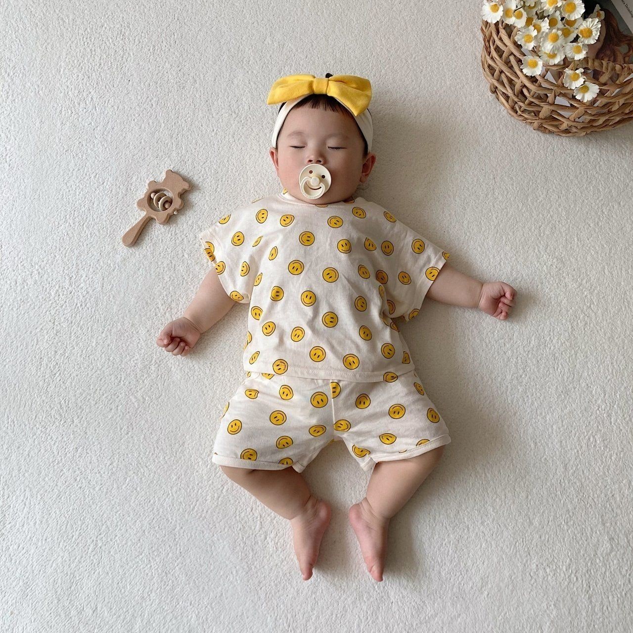 A fun relaxed top and matching shorts set featuring an allover happy face print.