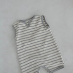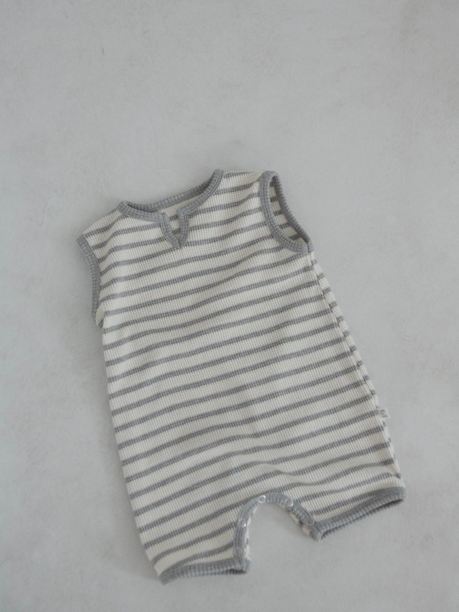 A sleeveless striped waffle romper featuring a slight v neck opening.