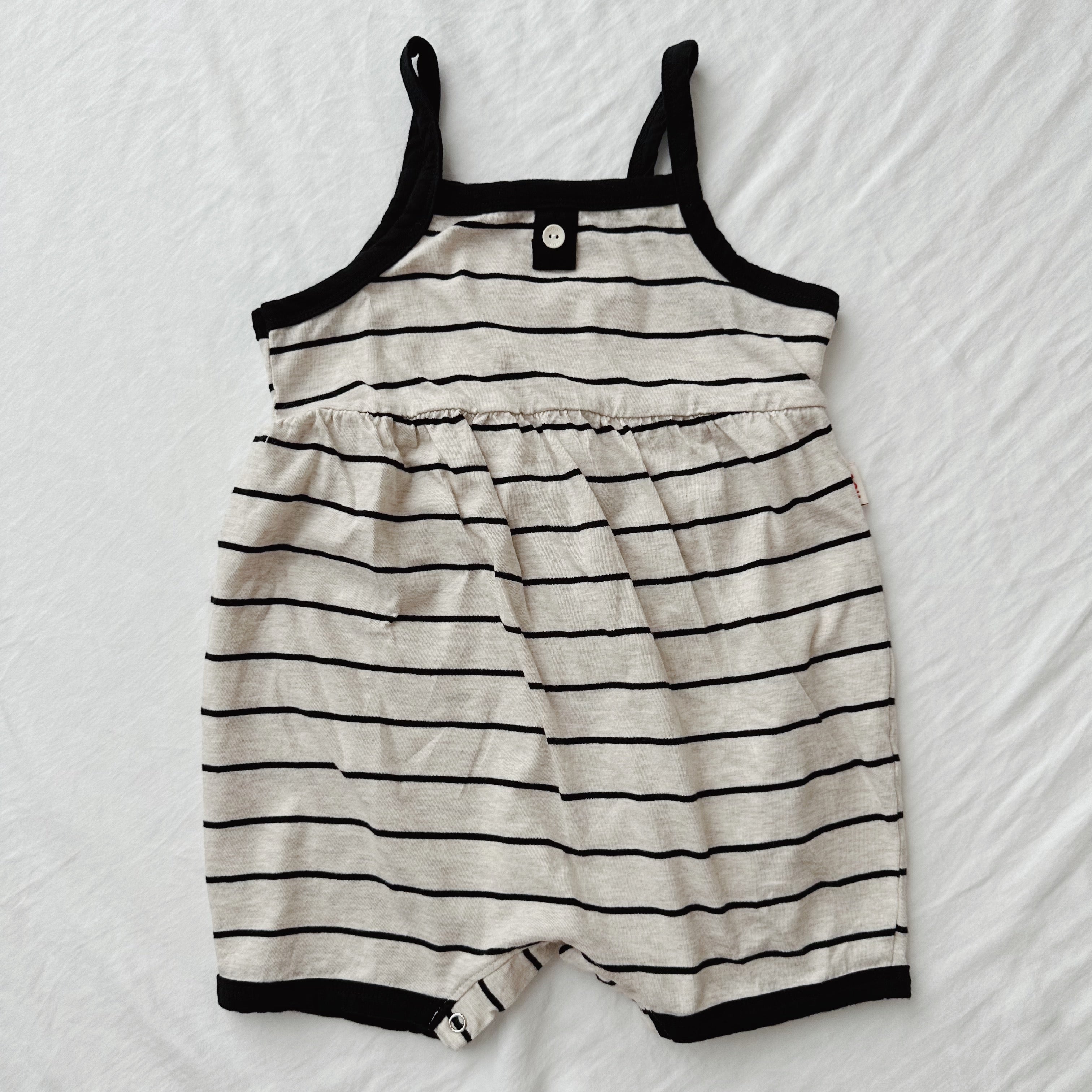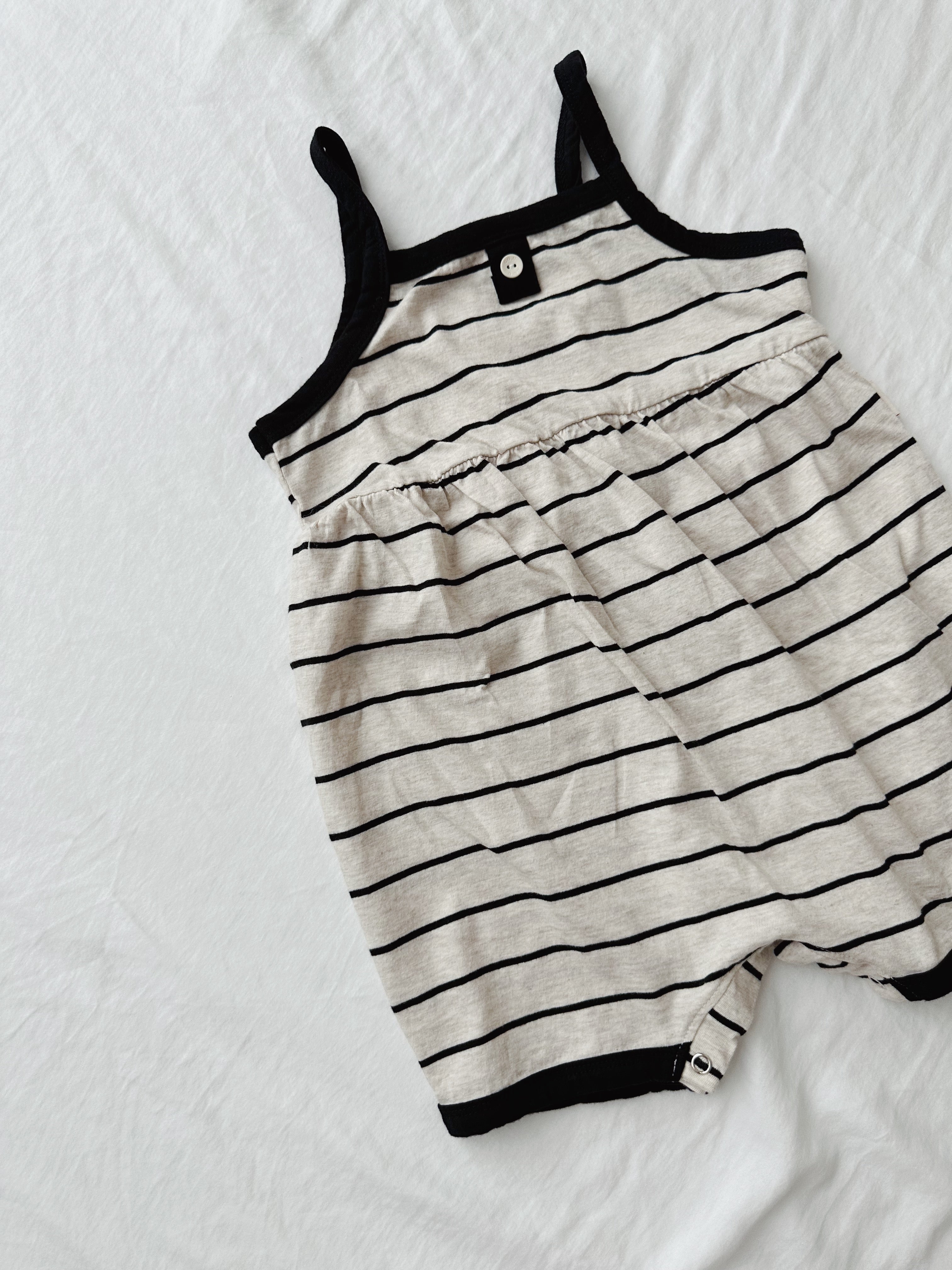 A breezy, loose fitting striped playsuit featuring a button detail on the front and snap closures.
