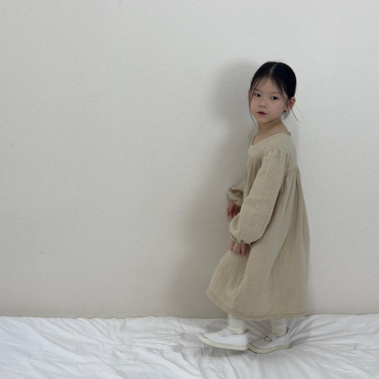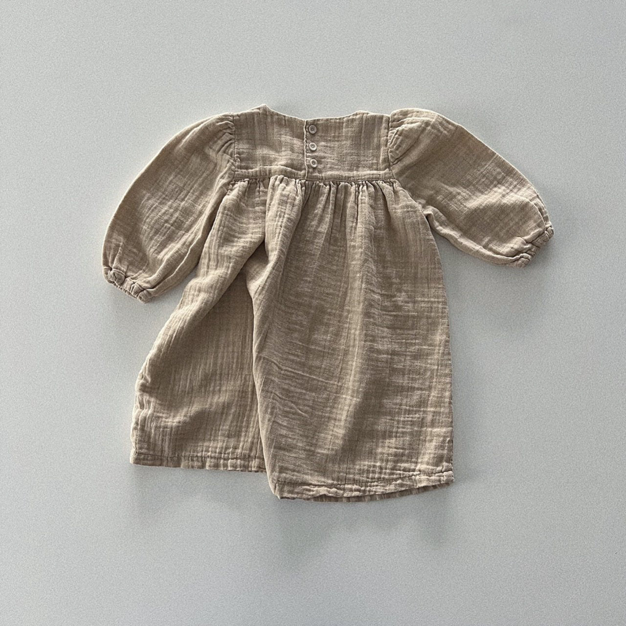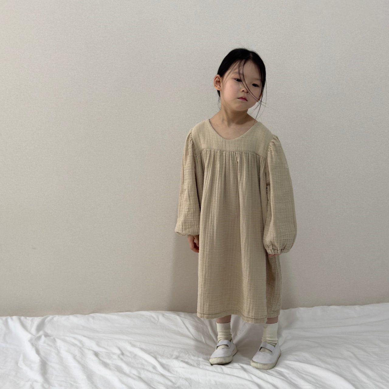 A long sleeve 'yoryu' crinkle dress featuring relaxed puff sleeves.