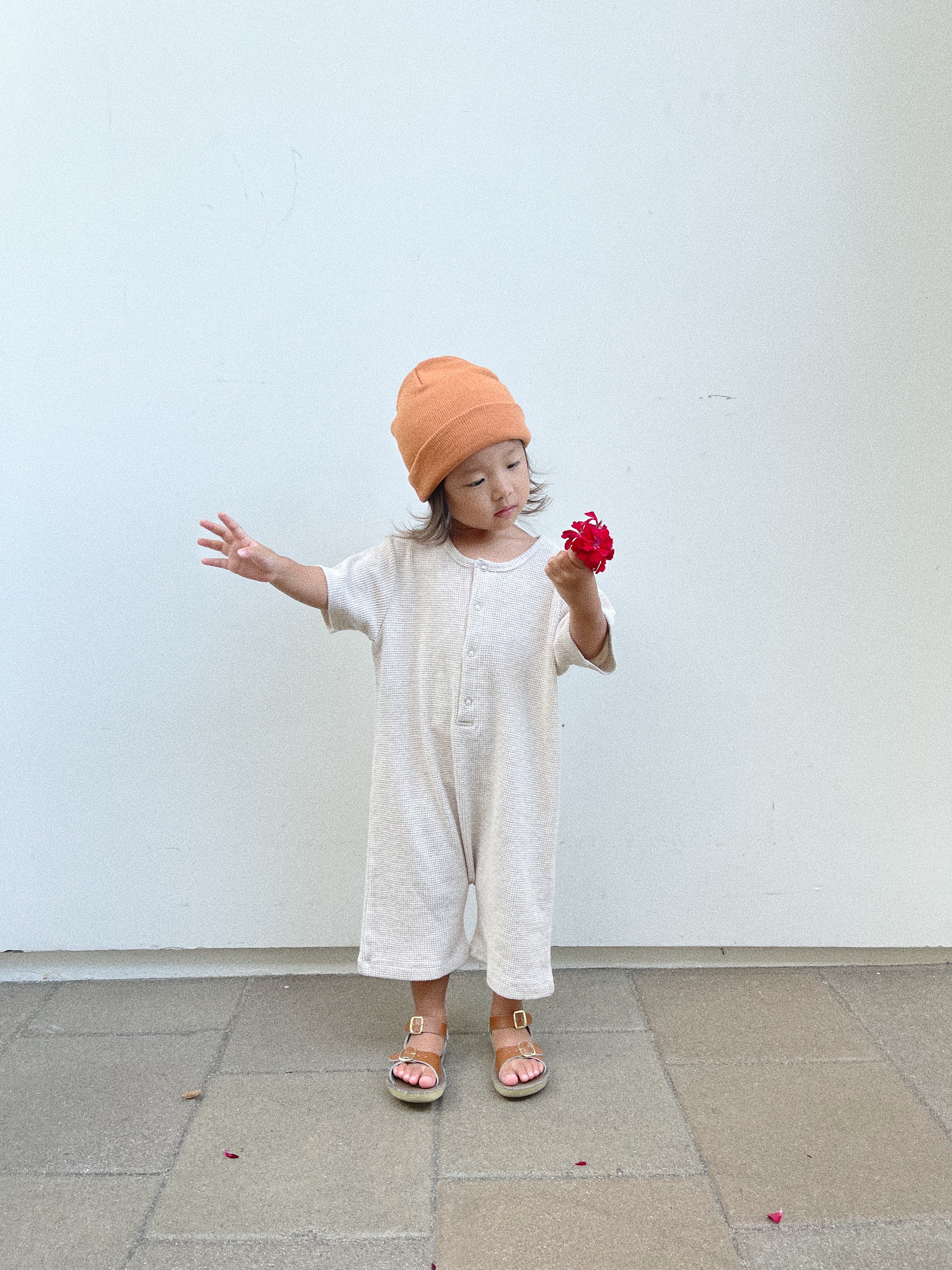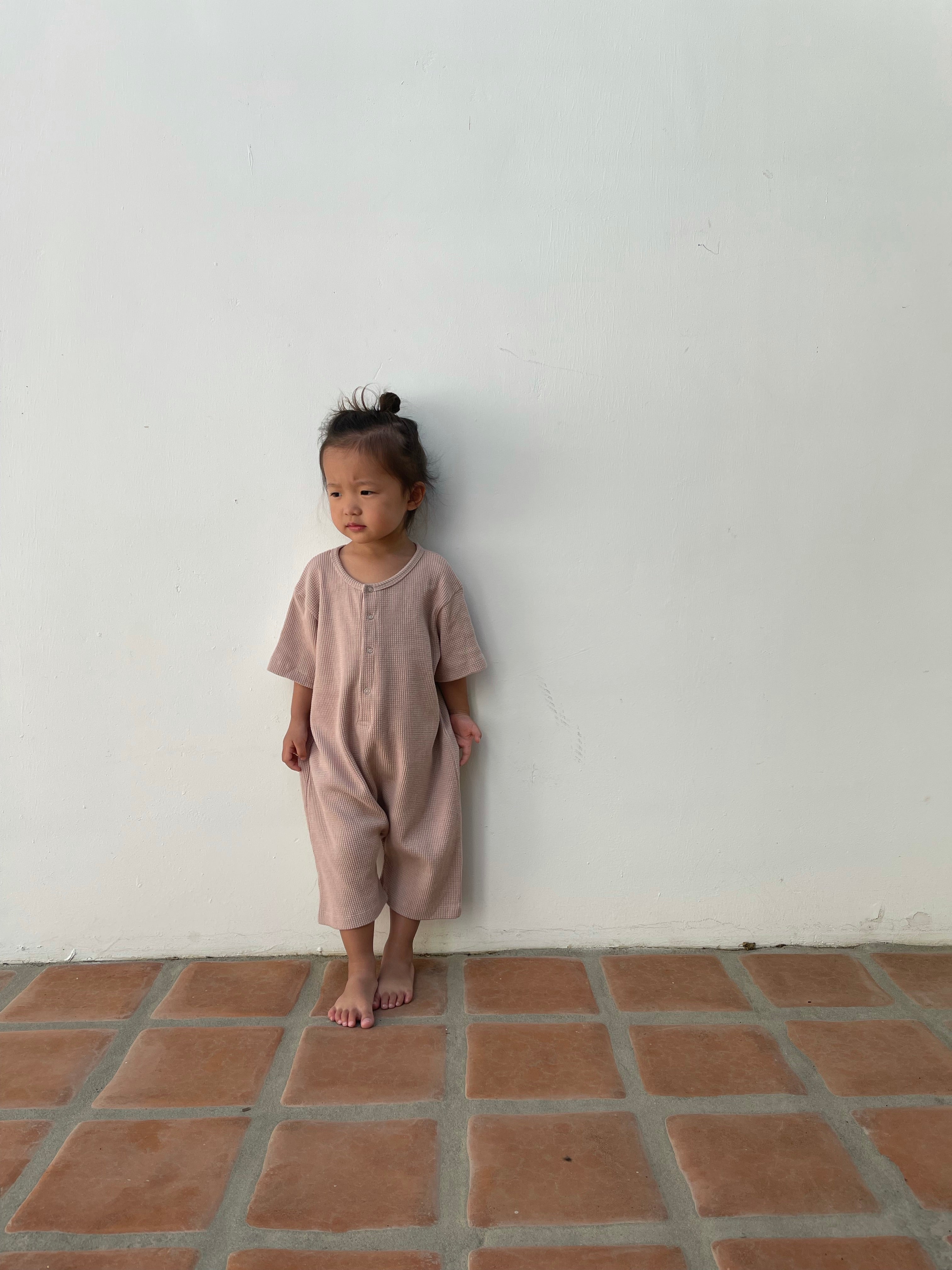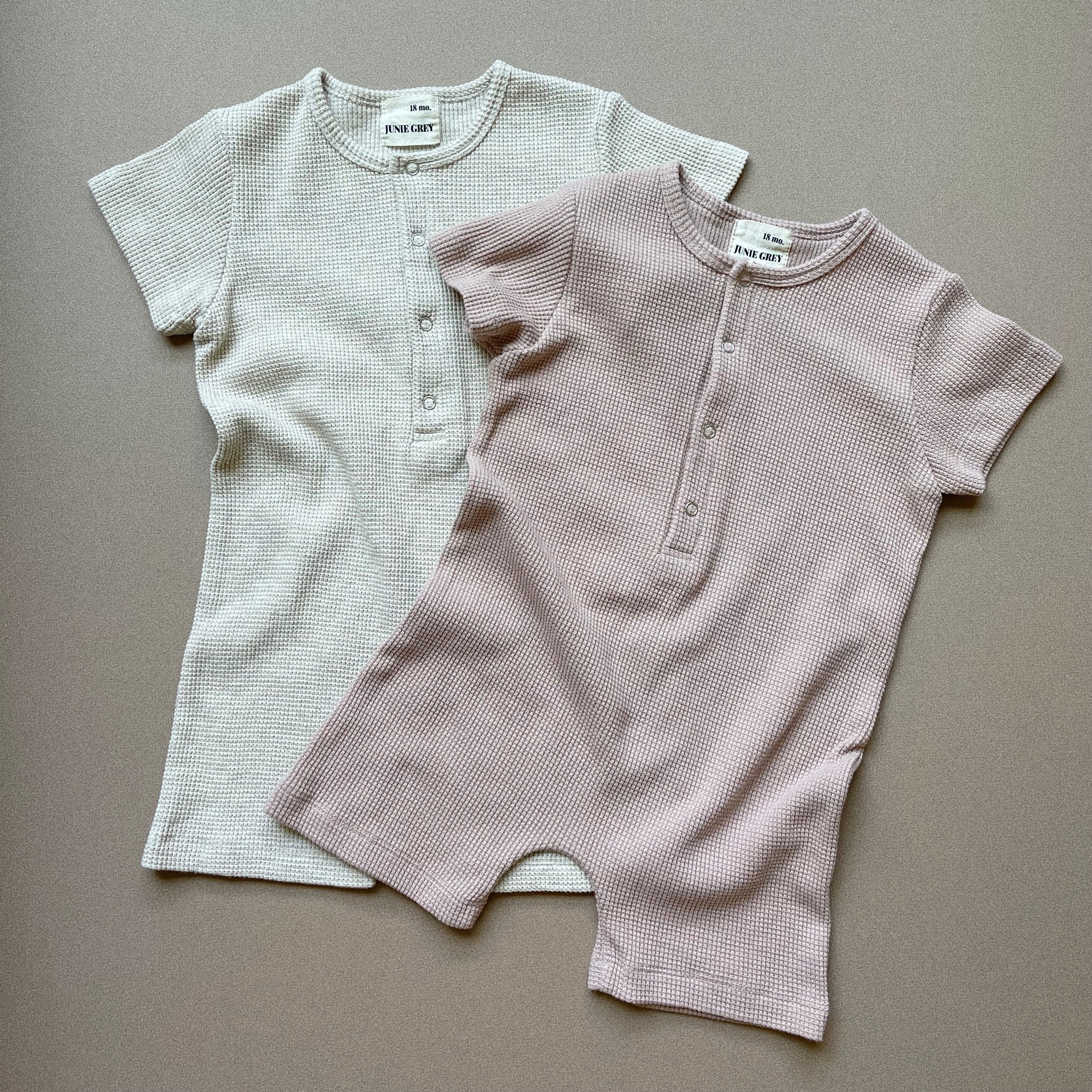 A short sleeved waffle playsuit featuring a snap button up detail.