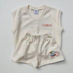 A sleeveless terry vest featuring embroidery on the front and a large graphic on the back. Matching shorts with an embroidery of the Disney character's face.