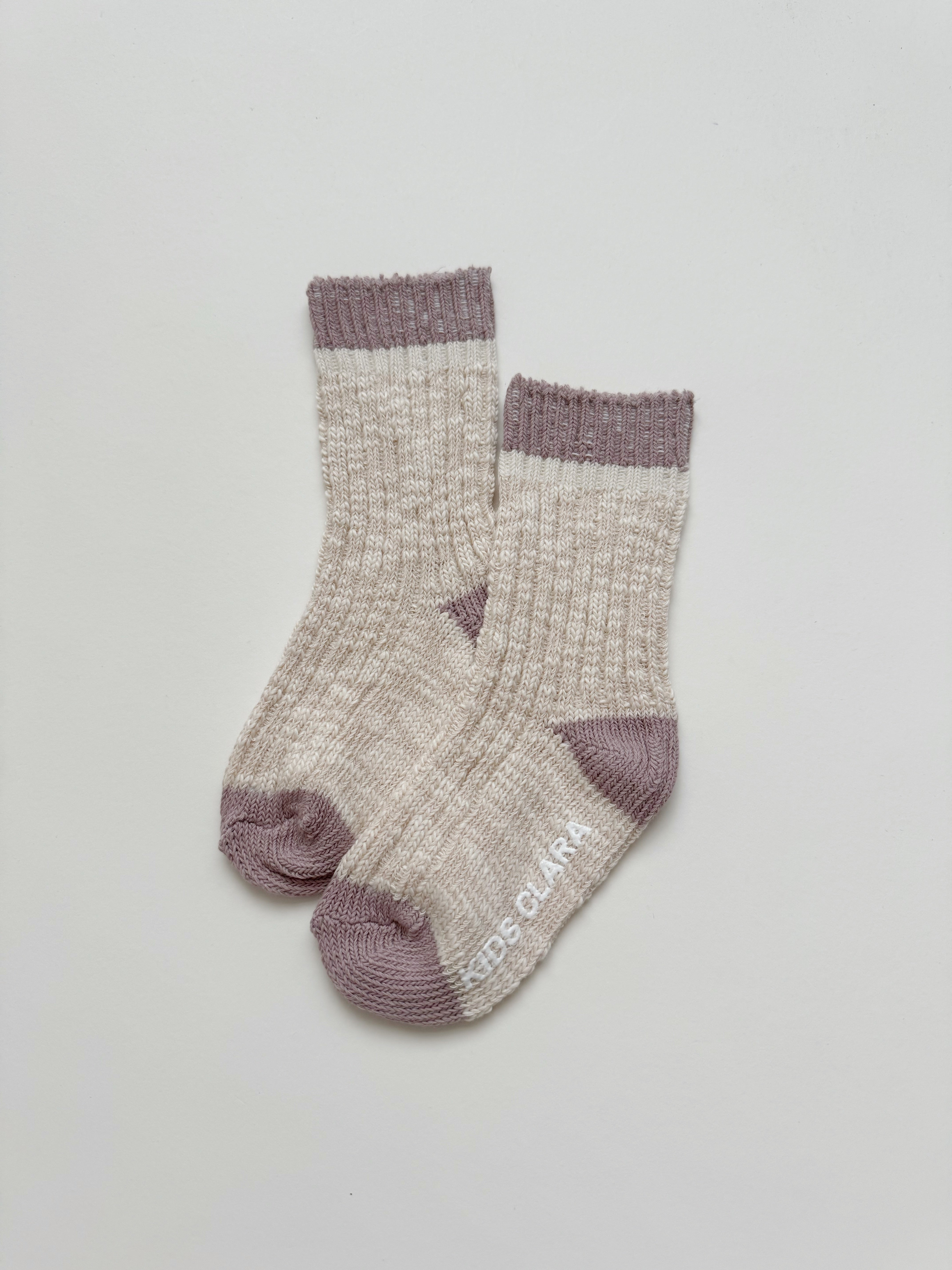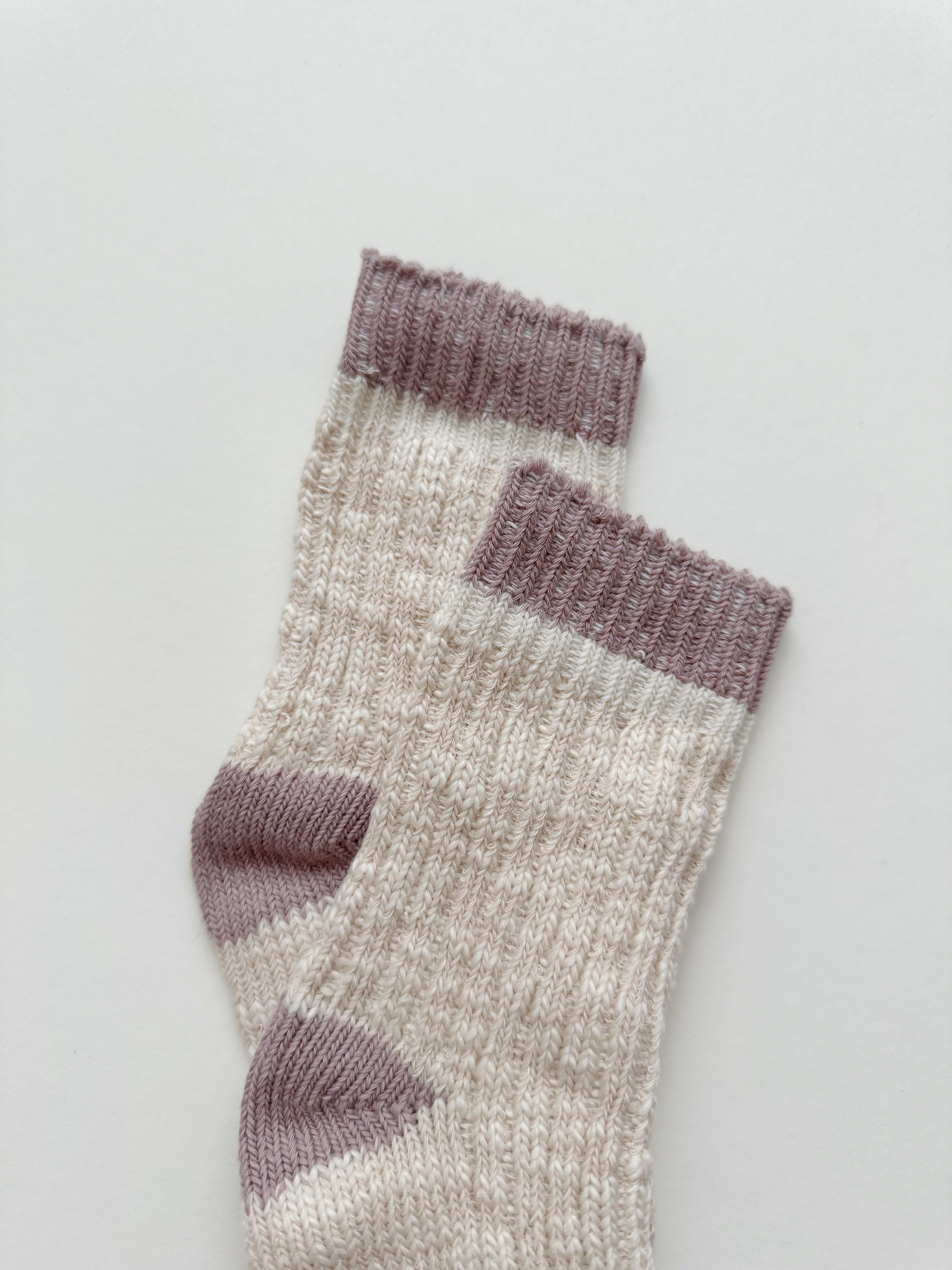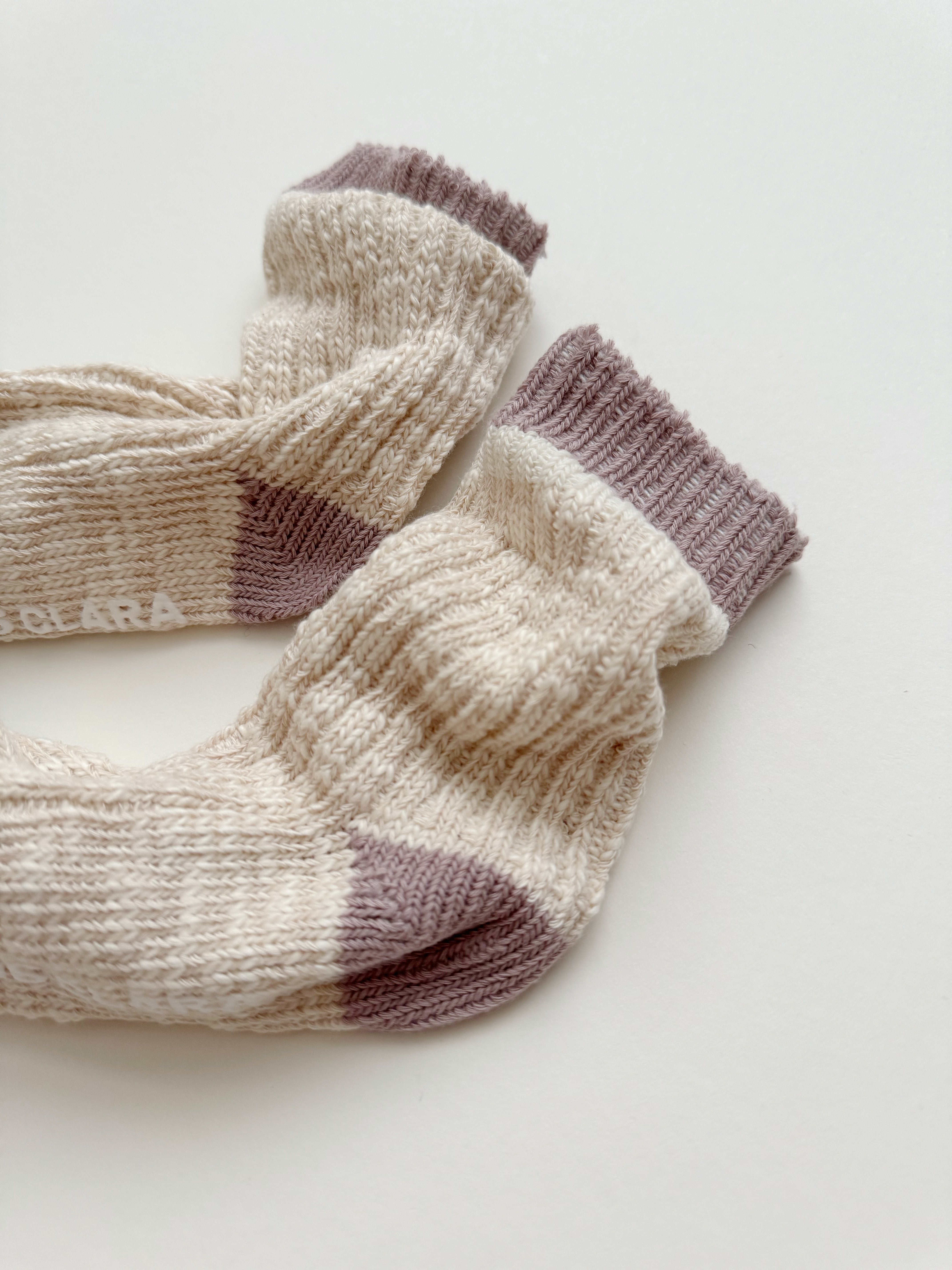 A pair of neutral knit socks featuring a contrast color on the edges.